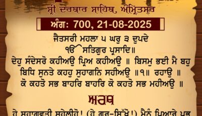ਸ੍ਰੀ ਦਰਬਾਰ ਸਾਹਿਬ ਤੋਂ ਅੱਜ ਦਾ ਹੁਕਮਨਾਮਾ 21-8-2025