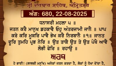 ਸ੍ਰੀ ਦਰਬਾਰ ਸਾਹਿਬ ਤੋਂ ਅੱਜ ਦਾ ਹੁਕਮਨਾਮਾ 23-8-2025