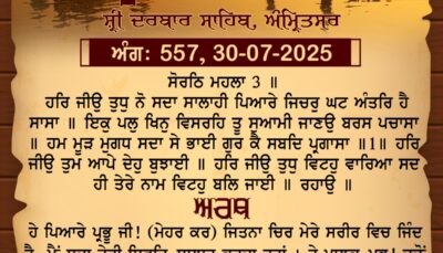 ਸ੍ਰੀ ਦਰਬਾਰ ਸਾਹਿਬ ਤੋਂ ਅੱਜ ਦਾ ਹੁਕਮਨਾਮਾ 30-7-2025