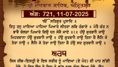ਸ੍ਰੀ ਦਰਬਾਰ ਸਾਹਿਬ ਤੋਂ ਅੱਜ ਦਾ ਹੁਕਮਨਾਮਾ 11-7-2025