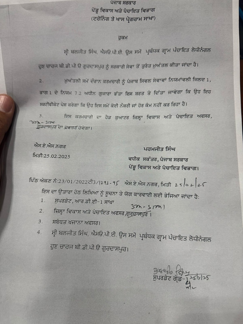 9 ਲੱਖ ਗਬਨ ਕਰਨ ਦਾ ਮਾਮਲਾ, ਪੰਜਾਬ ਸਰਕਾਰ ਜ਼ਿਲ੍ਹਾ ਪੰਚਾਇਤੀ ਅਫਸਰ ਨੂੰ ਕੀਤਾ ਮੁਅੱਤਲ