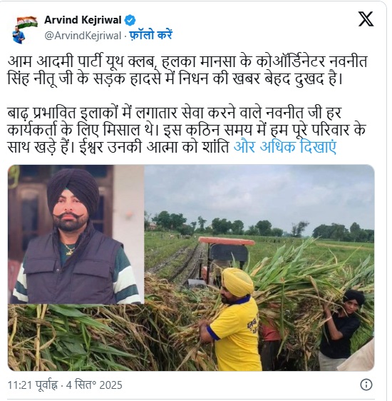ਕੇਜਰੀਵਾਲ ਨੇ ਸੋਸ਼ਲ ਮੀਡੀਆ ਪਲੇਟਫਾਰਮ ਐਕਸ ‘ਤੇ ਪੋਸਟ ਕਰਕੇ ਲਿਖਿਆ ਕਿ ਨਵਨੀਤ ਸਿੰਘ ਨੀਤੂ ਦੀ ਸੜਕ ਹਾਦਸੇ ਵਿੱਚ ਮੌਤ ਦੀ ਖ਼ਬਰ ਬਹੁਤ ਦੁਖਦਾਈ ਹੈ। ਹੜ੍ਹ ਪ੍ਰਭਾਵਿਤ ਇਲਾਕਿਆਂ ਵਿੱਚ ਲਗਾਤਾਰ ਸੇਵਾ ਕਰਨ ਵਾਲੀ ਨਵਨੀਤ ਹਰ ਵਰਕਰ ਲਈ ਇੱਕ ਉਦਾਹਰਣ ਸੀ। ਅਸੀਂ ਇਸ ਮੁਸ਼ਕਲ ਸਮੇਂ ਵਿੱਚ ਪੂਰੇ ਪਰਿਵਾਰ ਦੇ ਨਾਲ ਖੜ੍ਹੇ ਹਾਂ। ਪਰਮਾਤਮਾ ਉਨ੍ਹਾਂ ਦੀ ਆਤਮਾ ਨੂੰ ਸ਼ਾਂਤੀ ਦੇਵੇ।