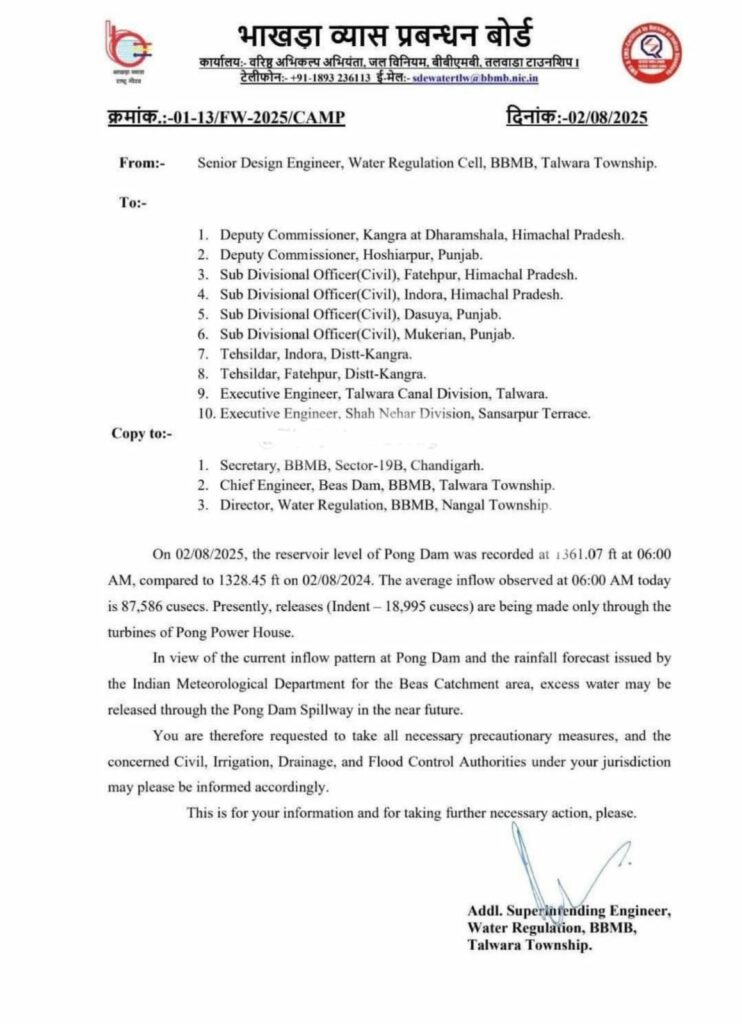 ਇਸ ਨੂੰ ਧਿਆਨ ਵਿੱਚ ਰੱਖਦੇ ਹੋਏ, ਪੌਂਗ ਡੈਮ ਪ੍ਰਬੰਧਨ ਅਧਿਕਾਰੀਆਂ ਨੇ ਹੁਣ ਹਿਮਾਚਲ ਦੇ ਕਾਂਗੜਾ, ਹੁਸ਼ਿਆਰਪੁਰ ਜ਼ਿਲ੍ਹਿਆਂ ਸਮੇਤ ਦਰਿਆ ਦੇ ਕੰਢੇ ਸਥਿਤ ਪਿੰਡਾਂ ਵਿੱਚ ਜ਼ਿਲ੍ਹਾ ਮੈਜਿਸਟ੍ਰੇਟ, ਸਿਹਤ ਜ਼ਿਲ੍ਹਾ ਅਧਿਕਾਰੀਆਂ ਸਮੇਤ ਵੱਖ-ਵੱਖ ਵਿਭਾਗਾਂ ਨੂੰ ਸਲਾਹ ਜਾਰੀ ਕੀਤੀ ਹੈ ਕਿ ਉਹ ਸੁਰੱਖਿਅਤ ਥਾਵਾਂ ‘ਤੇ ਜਾਣ। ਅੱਜ ਡੈਮ ਵਿੱਚ ਪਾਣੀ ਦਾ ਪੱਧਰ 1365.26 ਹੈ। ਜਿੱਥੇ 125099 ਕਿਊਸਿਕ ਪਾਣੀ ਡੈਮ ਤੱਕ ਪਹੁੰਚ ਰਿਹਾ ਹੈ। ਇਸ ਦੇ ਨਾਲ ਹੀ, ਮਹਾਰਾਣਾ ਪ੍ਰਤਾਪ ਝੀਲ ਦੇ ਲਗਭਗ 6 ਟਰਬਾਈਨਾਂ ਤੋਂ ਬਿਆਸ ਦਰਿਆ ਅਤੇ ਸ਼ਾਹ ਨਹਿਰ ਵਿਰਾਜ ਵਿੱਚ 16500 ਕਿਊਸਿਕ ਪਾਣੀ ਛੱਡਿਆ ਜਾ ਰਿਹਾ ਹੈ।