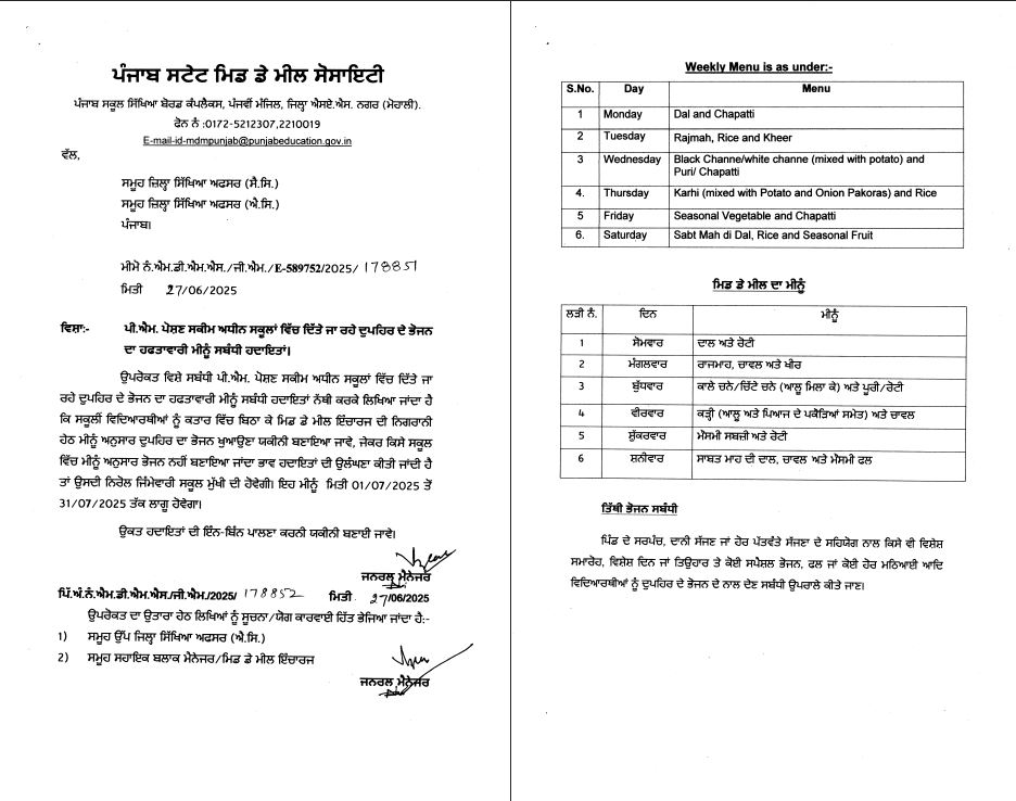 ਪੰਜਾਬ ਦੇ ਸਰਕਾਰੀ ਸਕੂਲਾਂ ’ਚ ਬੱਚਿਆਂ ਨੂੰ ਦਿੱਤੇ ਜਾਣ ਵਾਲੇ ਮਿਡ-ਡੇਅ ਮੀਲ ’ਚ ਬਦਲਾਅ ਕੀਤਾ ਗਿਆ ਹੈ। ਸਰਕਾਰ ਨੇ ਪ੍ਰਧਾਨ ਮੰਤਰੀ ਪੋਸ਼ਣ ਯੋਜਨਾ ਤਹਿਤ ਸਕੂਲਾਂ ’ਚ ਦਿੱਤੇ ਜਾਣ ਵਾਲੇ ਹਫਤਾਵਾਰੀ ਭੋਜਨ ਮੀਨੂੰ ਨੂੰ ਬਦਲਣ ਦੇ ਨਿਰਦੇਸ਼ ਦਿੱਤੇ ਹਨ। ਇਹ ਮੀਨੂੰ 1 ਤੋਂ 31 ਜੁਲਾਈ ਤੱਕ ਜਾਰੀ ਕੀਤੇ ਗਏ ਹਨ। ਇਸ ਨਿਰਦੇਸ਼ ’ਚ ਸਪੱਸ਼ਟ ਤੌਰ ’ਤੇ ਕਿਹਾ ਗਿਆ ਹੈ ਕਿ ਸਾਰੇ ਸਕੂਲਾਂ ’ਚ ਵਿਦਿਆਰਥੀਆਂ ਨੂੰ ਕਤਾਰ ’ਚ ਬਿਠਾਉਣ ਤੋਂ ਬਾਅਦ ਹੀ ਮਿਡ-ਡੇਅ ਮੀਲ ਦਿੱਤਾ ਜਾਵੇਗਾ ਅਤੇ ਮਿਡ-ਡੇਅ ਮੀਲ ਇੰਚਾਰਜ ਇਸ ਲਈ ਪੂਰੀ ਤਰ੍ਹਾਂ ਜ਼ਿੰਮੇਵਾਰ ਹੋਵੇਗਾ।
