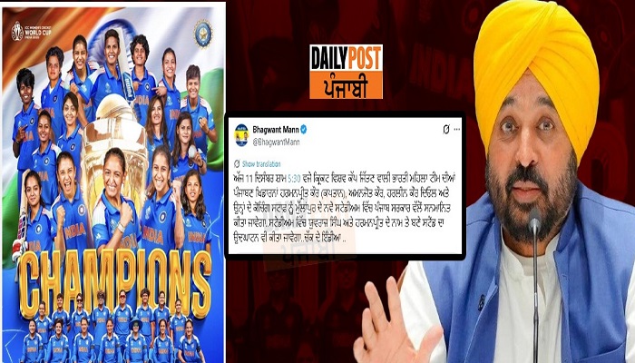 ਪੰਜਾਬ ਦੇ ਮੁੱਖ ਮੰਤਰੀ ਭਗਵੰਤ ਸਿੰਘ ਮਾਨ ਅੱਜ ਕ੍ਰਿਕਟ ਵਿਸ਼ਵ ਕੱਪ ਜਿੱਤਣ ਵਾਲੀ ਭਾਰਤੀ ਮਹਿਲਾ ਟੀਮ ਦੀਆਂ ਪੰਜਾਬਣ ਖਿਡਾਰਨਾਂ ਨਾਲ ਮੁਲਾਕਾਤ ਕਰਨਗੇ। ਸ਼ਾਮ ਕਰੀਬ 5:30 ਵਜੇ ਮੁੱਲਾਂਪੁਰ ਦੇ ਨਵੇਂ ਸਟੇਡੀਅਮ ਵਿੱਚ ਪ੍ਰੋਗਰਾਮ ਹੋਵੇਗਾ। ਇਹ ਜਾਣਕਾਰੀ ਖੁਦ ਮੁੱਖ ਮੰਤਰੀ ਭਗਵੰਤ ਮਾਨ ਨੇ ਸੋਸ਼ਲ ਮੀਡੀਆ ‘ਤੇ ਇੱਕ ਪੋਸਟ ਸਾਂਝੀ ਕਰਕੇ ਦਿੱਤੀ ਹੈ।