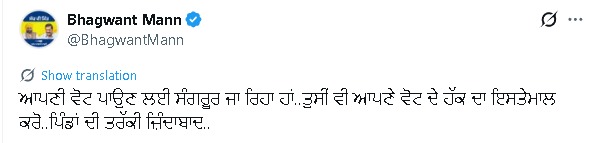 ਪੰਜਾਬ ਦੇ ਮੁੱਖ ਮੰਤਰੀ ਭਗਵੰਤ ਮਾਨ ਸੰਗਰੂਰ ਦੇ ਪਿੰਡ ਮੰਗਵਾਲ ਵਿੱਚ ਵੋਟ ਪਾਉਣਗੇ। ਉਹ ਦੁਪਹਿਰ ਕਰੀਬ 1 ਵਜੇ ਆਪਣੀ ਵੋਟ ਭੁਗਤਾਉਣਗੇ। ਉਨ੍ਹਾਂ ਨੇ ਆਪਣੇ ਸੋਸ਼ਲ ਮੀਡੀਆ ਅਕਾਊਂਟ ‘ਤੇ ਇਸ ਦਾ ਐਲਾਨ ਕੀਤਾ। ਉਨ੍ਹਾਂ ਨੇ ਲਿਖਿਆ ਕਿ ਤੁਸੀਂ ਵੀ ਆਪਣੇ ਵੋਟ ਦੇ ਹੱਕ ਦਾ ਇਸਤੇਮਾਲ ਕਰੋ..ਪਿੰਡਾਂ ਦੀ ਤਰੱਕੀ ਜ਼ਿੰਦਾਬਾਦ..।