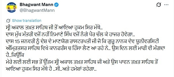 ਸ੍ਰੀ ਅਕਾਲ ਤਖ਼ਤ ਸਾਹਿਬ ਵੱਲੋਂ ਤਲਬ ਕੀਤੇ ਜਾਣ ਮਗਰੋਂ ਮੁੱਖ ਮੰਤਰੀ ਭਗਵੰਤ ਮਾਨ ਦਾ ਪਹਿਲਾ ਬਿਆਨ ਸਾਹਮਣੇ ਆਇਆ ਹੈ। ਉਨ੍ਹਾਂ ਕਿਹਾ ਕਿ ਦਾਸ ਮੁੱਖ ਮੰਤਰੀ ਵਜੋਂ ਨਹੀਂ ਨਿਮਾਣੇ ਸਿੱਖ ਵਜੋਂ ਨੰਗੇ ਪੈਰ ਚੱਲ ਕੇ ਹਾਜ਼ਰ ਹੋਵੇਗਾ।