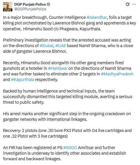 DGP ਗੌਰਵ ਯਾਦਵ ਨੇ ਟਵੀਟ ਕੀਤਾ ਕਿ ਮੁੱਢਲੀ ਜਾਂਚ ਤੋਂ ਪਤਾ ਲੱਗਿਆ ਹੈ ਕਿ ਗ੍ਰਿਫ਼ਤਾਰ ਕੀਤਾ ਗਿਆ ਦੋਸ਼ੀ ਦੁਬਈ, ਯੂ.ਏ.ਈ. ਸਥਿਤ, ਨਮਿਤ ਸ਼ਰਮਾ ਦੇ ਨਿਰਦੇਸ਼ਾਂ ‘ਤੇ ਕੰਮ ਕਰ ਰਿਹਾ ਸੀ, ਜੋ ਕਿ ਗੈਂਗਸਟਰ ਲਾਰੈਂਸ ਬਿਸ਼ਨੋਈ ਦਾ ਕਰੀਬੀ ਸਾਥੀ ਹੈ। ਹਾਲ ਹੀ ਵਿੱਚ, ਹਿਮਾਂਸ਼ੂ ਸੂਦ ਨੇ ਆਪਣੇ ਹੋਰ ਗੈਂਗ ਮੈਂਬਰਾਂ ਨਾਲ ਮਿਲ ਕੇ ਨਮਿਤ ਸ਼ਰਮਾ ਦੇ ਨਿਰਦੇਸ਼ਾਂ ‘ਤੇ ਹਰਿਦੁਆਰ ਵਿੱਚ ਇੱਕ ਹੋਟਲ ਮਾਲਕ ‘ਤੇ ਗੋਲੀਆਂ ਚਲਾਈਆਂ ਅਤੇ ਉਸਨੂੰ ਕ੍ਰਮਵਾਰ ਮੱਧ ਪ੍ਰਦੇਸ਼ ਅਤੇ ਕਪੂਰਥਲਾ ਵਿੱਚ 2 ਹੋਰ ਟੀਚਿਆਂ ਨੂੰ ਖਤਮ ਕਰਨ ਦਾ ਕੰਮ ਸੌਂਪਿਆ ਗਿਆ ਸੀ।