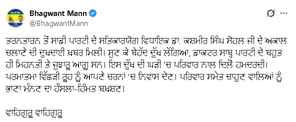ਸੋਸ਼ਲ ਮੀਡੀਆ ਪਲੇਟਫਾਰਮ ‘ਐਕਸ’ ‘ਤੇ ਪੋਸਟ ਕਰਦੇ ਹੋਏ ਸੀਐਮ ਮਾਨ ਨੇ ਲਿਖਿਆ ਕਿ ‘ਤਰਨਤਾਰਨ ਤੋਂ ਸਾਡੀ ਪਾਰਟੀ ਦੇ ਵਿਧਾਇਕ ਡਾ. ਕਸ਼ਮੀਰ ਸਿੰਘ ਸੋਹਲ ਦੇ ਅਚਾਨਕ ਦਿਹਾਂਤ ਦੀ ਦੁਖਦਾਈ ਖ਼ਬਰ ਮਿਲੀ। ਮੈਨੂੰ ਇਹ ਸੁਣ ਕੇ ਬਹੁਤ ਦੁੱਖ ਹੋਇਆ, ਡਾ. ਸਾਹਿਬ ਪਾਰਟੀ ਦੇ ਇੱਕ ਮਿਹਨਤੀ ਅਤੇ ਸੰਘਰਸ਼ਸ਼ੀਲ ਨੇਤਾ ਸਨ।’