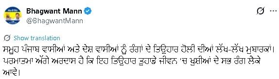 ਇਸ ਮੌਕੇ ‘ਤੇ ਮੁੱਖ ਮੰਤਰੀ ਭਗਵੰਤ ਮਾਨ ਸਮੂਹ ਦੇਸ਼ਵਾਸੀਆਂ ਨੂੰ ਹੋਲੀ ਦੀ ਵਧਾਈ ਦਿੱਤੀ। ਉਨ੍ਹਾਂ ਪਰਮਾਤਮਾ ਅੱਗੇ ਅਰਦਾਸ ਕਰਦਿਆਂ ਕਿਹਾ ਕਿ ਇਹ ਤਿਉਹਾਰ ਤੁਹਾਡੇ ਜੀਵਨ ‘ਚ ਖੁਸ਼ੀਆਂ ਦੇ ਸਭ ਰੰਗ ਲੈ ਕੇ ਆਵੇ।