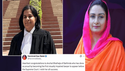 ਸੁਪਰੀਮ ਕੋਰਟ ‘ਚ ਪਹਿਲੀ ਨੇਤਰਹੀਣ ਵਕੀਲ ਬਣੀ ਬਠਿੰਡਾ ਦੀ ਆਂਚਲ ਭਠੇਜਾ, MP ਹਰਸਿਮਰਤ ਬਾਦਲ ਨੇ ਦਿੱਤੀ ਵਧਾਈ