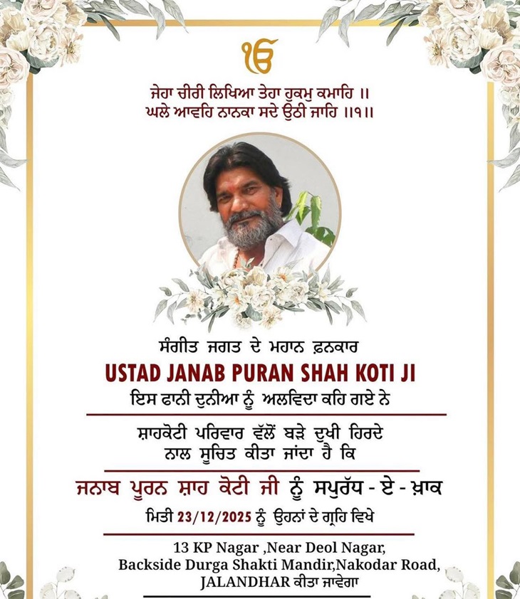 ਪ੍ਰਸਿੱਧ ਪੰਜਾਬੀ ਗਾਇਕ ਮਾਸਟਰ ਸਲੀਮ ਦੇ ਪਿਤਾ ਪੂਰਨ ਸ਼ਾਹਕੋਟੀ (72) ਦਾ ਸੋਮਵਾਰ ਨੂੰ ਦੇਹਾਂਤ ਹੋ ਗਿਆ। ਉਹ ਕੁਝ ਸਮੇਂ ਤੋਂ ਬਿਮਾਰ ਸਨ ਅਤੇ ਹਸਪਤਾਲ ਵਿੱਚ ਇਲਾਜ ਅਧੀਨ ਸਨ। ਉਨ੍ਹਾਂ ਦੇ ਪਿੱਛੇ ਦੋ ਪੁੱਤਰ ਮਾਸਟਰ ਸਲੀਮ ਅਤੇ ਪੇਜੀ ਸ਼ਾਹਕੋਟੀ ਹਨ। ਸ਼ਾਹਕੋਟੀ ਪੰਜਾਬੀ ਸੰਗੀਤ ਉਦਯੋਗ ਦੀ ਇੱਕ ਪ੍ਰਮੁੱਖ ਹਸਤੀ ਸਨ। ਉਨ੍ਹਾਂ ਨੇ ਹੰਸਰਾਜ ਹੰਸ, ਜਸਬੀਰ ਜੱਸੀ ਅਤੇ ਬੱਬੂ ਮਾਨ ਸਣੇ ਕਈ ਮਸ਼ਹੂਰ ਗਾਇਕਾਂ ਨੂੰ ਸੰਗੀਤ ਸਿਖਾਇਆ।