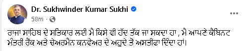 ਡਾ. ਸੁਖਵਿੰਦਰ ਕੁਮਾਰ ਸੁੱਖੀ ਨੇ ਆਪਣੇ ਫੇਸਬੁੱਕ ਅਕਾਊਂਟ ‘ਤੇ ਲਾਈਵ ਹੋ ਕੇ ਕਿਹਾ ਕਿ ਮੈਂ ਰਾਜੇ ਦਾ ਹਾਂ, ਰਾਜੇ ਦੀ ਸੰਗਤ ਦਾ ਹਾਂ। ਮੇਰੇ ਲਈ ਇਹ ਰਾਜਨੀਤੀ ਦਾ ਘਰ ਨਹੀਂ ਇਹ ਰੱਬ ਦਾ ਘਰ ਹੈ। ਰਾਜਾ ਸਾਹਿਬ ਦੇ ਸਤਿਕਾਰ ਲਈ ਮੈਂ ਕਿਸੇ ਵੀ ਹੱਦ ਤੱਕ ਜਾ ਸਕਦਾ ਹਾਂ। ਮੈਂ ਆਪਣੇ ਕੈਬਨਿਟ ਮੰਤਰੀ ਰੈਂਕ ਅਤੇ ਚੇਅਰਮੈਨ ਕਨਵੇਅਰ ਦੇ ਅਹੁਦੇ ਤੋਂ ਅਸਤੀਫਾ ਦਿੰਦਾ ਹਾਂ।