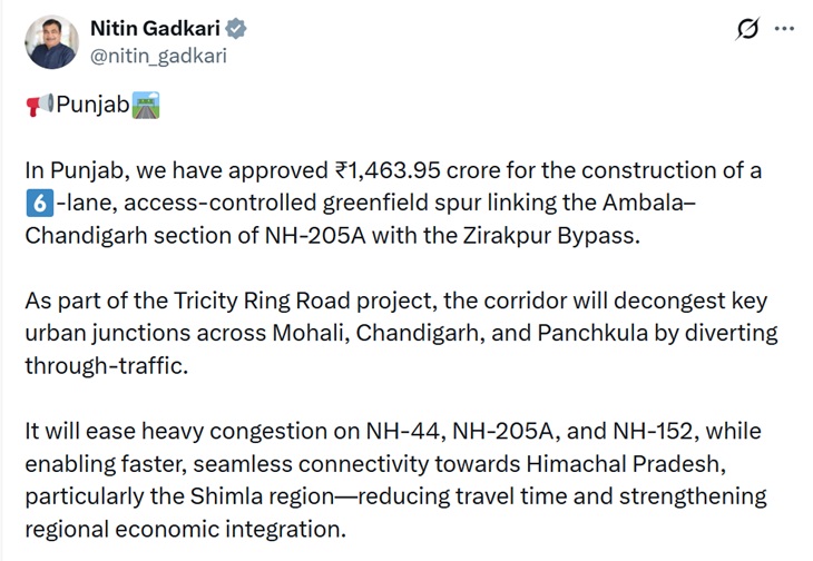 ਪੰਜਾਬ ਵਿੱਚ 6 ਲੇਨ ਐਕਸੈੱਸ-ਕੰਟ੍ਰੋਲਡ ਗ੍ਰੀਨਫੀਲਡ ਸਪਰ ਬਣੇਗਾ। ਇਸ ਨੂੰ ਲੈ ਕੇ ਕੇਂਦਰ ਸਰਕਾਰ ਨੇ ਮਨਜ਼ੂਰੀ ਦੇ ਦਿੱਤੀ ਹੈ, ਜਿਸਦੀ ਲਾਗਤ 1,463.95 ਕਰੋੜ ਰੁਪਏ ਆਏਗੀ। ਇਹ ਸਪਰ ਨੈਸ਼ਨਲ ਹਾਈਵੇ 205A ਦੇ ਅੰਬਾਲਾ-ਚੰਡੀਗੜ੍ਹ ਸੈਕਸ਼ਨ ਨੂੰ ਜ਼ੀਰਕਪੁਰ ਬਾਈਪਾਸ ਨਾਲ ਜੋੜੇਗਾ ਅਤੇ ਟ੍ਰਾਈਸਿਟੀ ਰਿੰਗ ਰੋਡ ਪ੍ਰੋਜੈਕਟ ਦਾ ਇੱਕ ਮੁੱਖ ਹਿੱਸਾ ਬਣੇਗਾ। ਕੇਂਦਰੀ ਸੜਕ ਆਵਾਜਾਈ ਮੰਤਰੀ ਨਿਤਿਨ ਗਡਕਰੀ ਨੇ ਵੀਰਵਾਰ ਨੂੰ ਦੁਪਹਿਰ 1 ਵਜੇ ਦੇ ਕਰੀਬ ਸੋਸ਼ਲ ਮੀਡੀਆ (X) ‘ਤੇ ਇਹ ਜਾਣਕਾਰੀ ਸਾਂਝੀ ਕੀਤੀ।