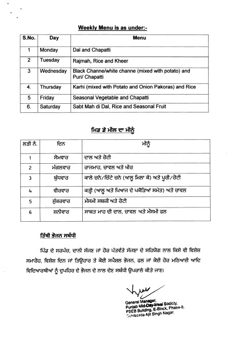 ਪੰਜਾਬ ਸਟੇਟ ਮਿਡ-ਡੇਅ ਮੀਲ ਸੁਸਾਇਟੀ ਨੇ ਪ੍ਰਧਾਨ ਮੰਤਰੀ ਪੋਸ਼ਣ ਯੋਜਨਾ ਤਹਿਤ ਸਰਕਾਰੀ ਸਕੂਲਾਂ ਵਿੱਚ ਪਰੋਸੇ ਜਾਣ ਵਾਲੇ ਮਿਡ-ਡੇਅ ਮੀਲ ਲਈ ਅਗਸਤ 2025 ਲਈ ਨਵਾਂ ਹਫ਼ਤਾਵਾਰੀ ਮੀਨੂ ਜਾਰੀ ਕੀਤਾ ਹੈ। ਇਹ ਮੀਨੂ 1 ਤੋਂ 31 ਅਗਸਤ ਤੱਕ ਲਾਗੂ ਰਹੇਗਾ। ਨਵੀਆਂ ਹਦਾਇਤਾਂ ਮੁਤਾਬਕ ਸਾਰੇ ਜ਼ਿਲ੍ਹਾ ਸਿੱਖਿਆ ਅਧਿਕਾਰੀਆਂ (ਸੈਕੰਡਰੀ ਅਤੇ ਐਲੀਮੈਂਟਰੀ) ਨੂੰ ਭੇਜੇ ਗਏ ਪੱਤਰ ਵਿੱਚ ਇਹ ਸਪੱਸ਼ਟ ਕੀਤਾ ਗਿਆ ਹੈ ਕਿ ਵਿਦਿਆਰਥੀਆਂ ਨੂੰ ਭੋਜਨ ਸਿਰਫ਼ ਮਿਡ-ਡੇਅ ਮੀਲ ਇੰਚਾਰਜ ਦੀ ਨਿਗਰਾਨੀ ਹੇਠ ਕਤਾਰ ਵਿੱਚ ਬਿਠਾ ਕੇ ਹੀ ਦਿੱਤਾ ਜਾਵੇ ਅਤੇ ਇਸ ਮੀਨੂ ਨੂੰ ਸਖ਼ਤੀ ਨਾਲ ਲਾਗੂ ਕੀਤਾ ਜਾਵੇ। ਇਹ ਵੀ ਹਦਾਇਤ ਕੀਤੀ ਗਈ ਹੈ ਕਿ ਜੇ ਕਿਸੇ ਵੀ ਸਕੂਲ ਵਿੱਚ ਤੈਅ ਮੀਨੂ ਦੀ ਪਾਲਣਾ ਨਹੀਂ ਕੀਤੀ ਜਾਂਦੀ ਹੈ, ਤਾਂ ਸਾਰੀ ਜ਼ਿੰਮੇਵਾਰੀ ਸਬੰਧਤ ਸਕੂਲ ਮੁਖੀ ਦੀ ਹੋਵੇਗੀ।