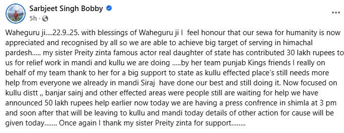 ਹਿਮਾਚਲ ਪ੍ਰਦੇਸ਼ ਦੀ ਧੀ, ਬਾਲੀਵੁੱਡ ਅਦਾਕਾਰਾ ਅਤੇ ਪੰਜਾਬ ਕਿੰਗਜ਼ ਦੀ ਸਹਿ-ਮਾਲਕ ਪ੍ਰੀਤੀ ਜ਼ਿੰਟਾ ਨੇ ਆਫ਼ਤ ਤੋਂ ਪ੍ਰਭਾਵਿਤ ਲੋਕਾਂ ਲਈ ਮਦਦ ਦਾ ਹੱਥ ਵਧਾਇਆ ਹੈ। ਉਸਨੇ ਹਿਮਾਚਲ ਪ੍ਰਦੇਸ਼ ਵਿੱਚ ਆਫ਼ਤ ਤੋਂ ਪ੍ਰਭਾਵਿਤ ਲੋਕਾਂ ਦੀ ਮਦਦ ਲਈ 30 ਲੱਖ ਰੁਪਏ ਦਾਨ ਕੀਤੇ ਹਨ। ਪ੍ਰੀਤੀ ਜ਼ਿੰਟਾ ਨੇ ਕਿੰਗਜ਼ ਇਲੈਵਨ ਪੰਜਾਬ ਵੱਲੋਂ ਇਹ ਵਿੱਤੀ ਸਹਾਇਤਾ ਪ੍ਰਦਾਨ ਕੀਤੀ।