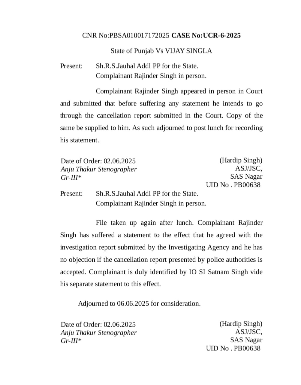 ਸਾਬਕਾ ਸਿਹਤ ਮੰਤਰੀ ਅਤੇ ਆਮ ਆਦਮੀ ਪਾਰਟੀ ਦੇ ਵਿਧਾਇਕ ਵਿਜੇ ਸਿੰਗਲਾ ਨੂੰ ਭ੍ਰਿਸ਼ਟਾਚਾਰ ਦੇ ਮਾਮਲੇ ਵਿਚ ਕਲੀਨ ਚਿੱਟ ਮਿਲ ਸਕਦੀ ਹੈ। ਸੂਤਰਾਂ ਮੁਤਾਬਕ ਸਬੂਤਾਂ ਦੀ ਘਾਟ ਕਾਰਨ ਵਿਧਾਇਕ ਨੂੰ ਕਲੀਨ ਚਿੱਟ ਦੇਣ ਦੀ ਤਿਆਰੀ ਹੈ। ਇਸ ਮਾਮਲੇ ਵਿੱਚ ਮੋਹਾਲੀ ਪੁਲਿਸ ਨੇ ਮੋਹਾਲੀ ਦੀ ਅਦਾਲਤ ‘ਚ ਕਲੋਜ਼ਰ ਰਿਪੋਰਟ ‘ਮਾਮਲਾ ਰੱਦ ਕਰਨ ਸਬੰਧੀ’ ਦਾਖ਼ਲ ਕਰ ਦਿੱਤੀ ਹੈ।
