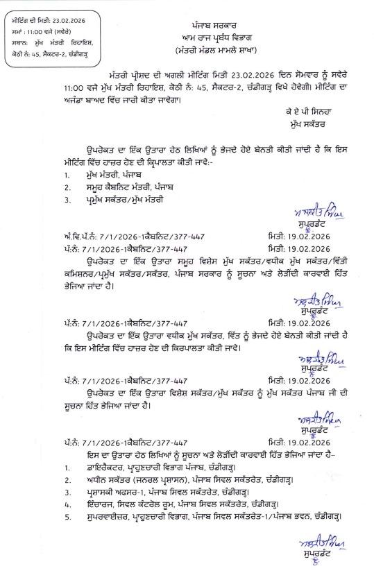 ਪੰਜਾਬ ਦੇ ਮੁੱਖ ਮੰਤਰੀ ਭਗਵੰਤ ਸਿੰਘ ਮਾਨ ਵੱਲੋਂ ਪੰਜਾਬ ਕੈਬਨਿਟ ਦੀ ਮੀਟਿੰਗ ਸੱਦੀ ਗਈ ਹੈ। ਚੰਡੀਗੜ੍ਹ ਸਥਿਤ ਮੁੱਖ ਮੰਤਰੀ ਦੀ ਰਿਹਾਇਸ਼ ‘ਤੇ 23 ਫਰਵਰੀ ਯਾਨੀ ਸੋਮਵਾਰ ਨੂੰ ਸਵੇਰੇ 11 ਵਜੇ ਬੈਠਕ ਹੋਵੇਗੀ। ਇਹ ਮੀਟਿੰਗ ਸੀ.ਐੱਮ. ਭਗਵੰਤ ਮਾਨ ਦੀ ਅਗਵਾਈ ਹੇਠ ਹੋਵੇਗੀ। ਮੀਟਿੰਗ ਦਾ ਏਜੰਡਾ ਅਜੇ ਜਾਰੀ ਨਹੀਂ ਕੀਤਾ ਗਿਆ। ਪਰ ਮੀਟਿੰਗ ਵਿੱਚ ਕਈ ਅਹਿਮ ਫੈਸਲਿਆਂ ‘ਤੇ ਮੋਹਰ ਲੱਗਣ ਦੀ ਸੰਭਾਵਨਾ ਹੈ।