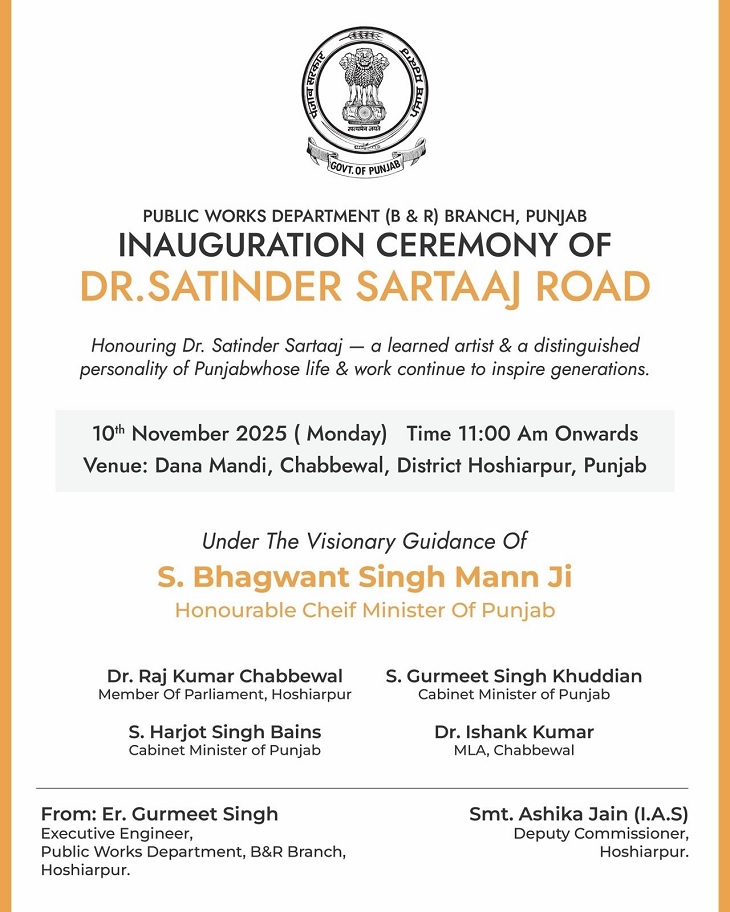 ਸੜਕ ਦਾ ਉਦਘਾਟਨ ਸਮਾਰੋਹ 10 ਨਵੰਬਰ ਨੂੰ ਸਵੇਰੇ 10 ਵਜੇ ਹੋਵੇਗਾ। ਮੁੱਖ ਮੰਤਰੀ ਭਗਵੰਤ ਮਾਨ ਇਸ ਸਮਾਰੋਹ ਦੀ ਪ੍ਰਧਾਨਗੀ ਕਰਨਗੇ। ਸੰਸਦ ਮੈਂਬਰ ਰਾਜ ਕੁਮਾਰ ਚੱਬੇਵਾਲ, ਕੈਬਨਿਟ ਮੰਤਰੀ ਗੁਰਮੀਤ ਸਿੰਘ, ਸਿੱਖਿਆ ਮੰਤਰੀ ਹਰਜੋਤ ਸਿੰਘ ਬੈਂਸ ਅਤੇ ਵਿਧਾਇਕ ਡਾ. ਇੰਸ਼ਾਕ ਇਸ ਮੌਕੇ ‘ਤੇ ਮੌਜੂਦ ਰਹਿਣਗੇ।