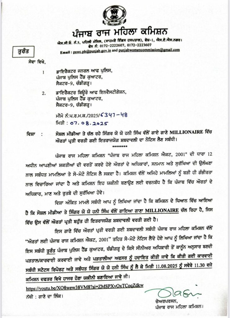 ਪੰਜਾਬ ਮਹਿਲਾ ਕਮਿਸ਼ਨ ਦੀ ਪ੍ਰਧਾਨ ਰਾਜ ਲਾਲੀ ਗਿੱਲ ਨੇ ਡੀਜੀਪੀ ਨੂੰ ਦੋ ਪੱਤਰ ਲਿਖੇ ਹਨ। ਪਹਿਲੇ ਪੱਤਰ ਵਿੱਚ ਕਿਹਾ ਗਿਆ ਹੈ ਕਿ ਯੋ ਯੋ ਹਨੀ ਸਿੰਘ ਦਾ ਗੀਤ ‘ਮਿਲੀਅਨੇਅਰ’ ਸੋਸ਼ਲ ਮੀਡੀਆ ‘ਤੇ ਵਾਇਰਲ ਹੋ ਰਿਹਾ ਹੈ। ਗੀਤ ਵਿੱਚ ਉਨ੍ਹਾਂ ਨੇ ਔਰਤਾਂ ਪ੍ਰਤੀ ਬਹੁਤ ਹੀ ਇਤਰਾਜ਼ਯੋਗ ਭਾਸ਼ਾ ਦੀ ਵਰਤੋਂ ਕੀਤੀ ਹੈ। ਦੂਜੇ ਪੱਤਰ ਵਿੱਚ ਕਮਿਸ਼ਨ ਨੇ ਕਰਨ ਔਜਲਾ ਦੇ ਗੀਤ ‘ਐਮਐਮ ਗਬਰੂ’ ਦਾ ਜ਼ਿਕਰ ਕੀਤਾ ਹੈ। ਕਮਿਸ਼ਨ ਨੇ ਕਿਹਾ ਕਿ ਇਹ ਗੀਤ ਸੋਸ਼ਲ ਮੀਡੀਆ ‘ਤੇ ਵੀ ਵਾਇਰਲ ਹੋ ਰਿਹਾ ਹੈ। ਇਸ ਵਿੱਚ ਵੀ ਔਰਤਾਂ ਲਈ ਗਲਤ ਸ਼ਬਦਾਂ ਦੀ ਵਰਤੋਂ ਕੀਤੀ ਗਈ ਹੈ, ਜੋ ਕਿ ਪੂਰੀ ਤਰ੍ਹਾਂ ਇਤਰਾਜ਼ਯੋਗ ਹੈ।