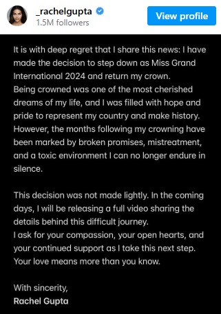 ਰੇਚਲ ਗੁਪਤਾ ਨੇ ਇੰਸਟਾਗ੍ਰਾਮ ‘ਤੇ ਪੋਸਟ ਕੀਤਾ ਅਤੇ ਦਾਅਵਾ ਕੀਤਾ ਕਿ ਉਸ ਨੇ ਖੁਦ ਅਹੁਦਾ ਛੱਡਣ ਦਾ ਫੈਸਲਾ ਕੀਤਾ ਹੈ। ਉਸਦੇ ਮੁਤਾਬਕ ਉਸ ਨੂੰ ਲਗਾਤਾਰ ਇੱਕ ਜ਼ਹਿਰੀਲੇ ਮਾਹੌਲ, ਟੁੱਟੇ ਵਾਅਦੇ ਅਤੇ ਮਾਨਸਿਕ ਤਸੀਹਿਆਂ ਦਾ ਸਾਹਮਣਾ ਕਰਨਾ ਪਿਆ। ਉਸ ਨੇ ਲਿਖਿਆ, ‘ਤਾਜ ਪਹਿਨਣਾ ਮੇਰਾ ਸੁਪਣਾ ਸੀ, ਪਰ ਉਸ ਤੋਂ ਬਾਅਦ ਕੀ ਹੋਇਆ, ਮੈਂ ਕਦੇ ਸੋਚਿਆ ਵੀ ਨਹੀਂ ਸੀ।’ ਰੇਚਲ ਨੇ ਇੱਕ ਵੀਡੀਓ ਵਿੱਚ ਪੂਰੀ ਸੱਚਾਈ ਦਾ ਖੁਲਾਸਾ ਕਰਨ ਦਾ ਵਾਅਦਾ ਕੀਤਾ ਹੈ।