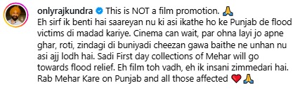 ਉਨ੍ਹਾਂ ਲਿਖਿਆ ਕਿ ਸਿਨੇਮਾ ਇੰਤਜ਼ਾਰ ਕਰ ਸਕਦਾ ਹੈ, ਪਰ ਇਨ੍ਹਾਂ ਲੋਕਾਂ ਨੇ ਆਪਣੇ ਘਰ, ਰੋਟੀ ਅਤੇ ਜ਼ਿੰਦਗੀ ਦੀਆਂ ਬੁਨਿਆਦੀ ਚੀਜ਼ਾਂ ਗੁਆ ਦਿੱਤੀਆਂ ਹਨ ਅਤੇ ਉਨ੍ਹਾਂ ਨੂੰ ਤੁਰੰਤ ਮਦਦ ਦੀ ਲੋੜ ਹੈ। ਇਸੇ ਲਈ ਉਨ੍ਹਾਂ ਦੀ ਫ਼ਿਲਮ ਮੇਹਰ ਦੀ ਪਹਿਲੇ ਦਿਨ ਦੀ ਕਮਾਈ ਹੜ੍ਹ ਰਾਹਤ ਲਈ ਦਾਨ ਕੀਤੀ ਜਾਵੇਗੀ। ਰਾਜ ਕੁੰਦਰਾ ਨੇ ਇਸਨੂੰ ਇੱਕ ਫਿਲਮ ਨਾਲੋਂ ਵੱਧ ਇੱਕ ਮਨੁੱਖੀ ਜ਼ਿੰਮੇਵਾਰੀ ਦੱਸਿਆ ਅਤੇ ਕਿਹਾ ਕਿ ਪਰਮਾਤਮਾ ਪੰਜਾਬ ਅਤੇ ਸਾਰੇ ਪ੍ਰਭਾਵਿਤ ਲੋਕਾਂ ‘ਤੇ ਮਿਹਰ ਕਰੇ। ਉਨ੍ਹਾਂ ਲੋਕਾਂ ਨੂੰ ਇਸ ਮੁਸ਼ਕਲ ਸਮੇਂ ਵਿੱਚ ਸਾਰੇ ਪੰਜਾਬੀਆਂ ਦੀ ਮਦਦ ਕਰਨ ਲਈ ਅੱਗੇ ਆਉਣ ਲਈ ਕਿਹਾ।