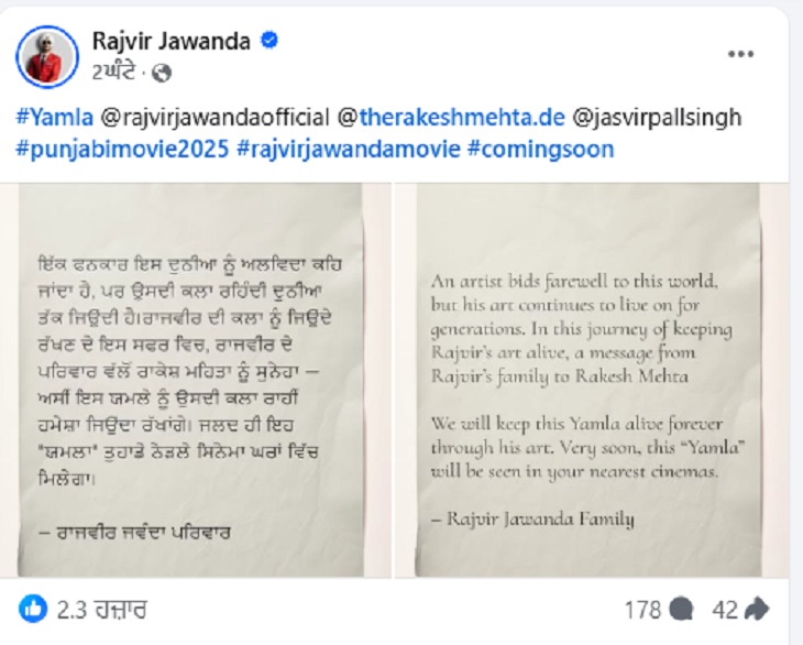 ਪਰਿਵਾਰ ਨੇ ਇੱਕ ਇਮੋਸ਼ਨਲ ਮੈਸੇਜ ਵੀ ਸ਼ੇਅਰ ਕੀਤਾ ਹੈ, ਜਿਸ ਵਿੱਚ ਲਿਖਿਆ ਹੈ, “ਇੱਕ ਕਲਾਕਾਰ ਇਸ ਦੁਨੀਆ ਨੂੰ ਅਲਵਿਦਾ ਕਹਿ ਜਾਂਦਾ ਹੈ, ਪਰ ਉਸ ਦੀ ਕਲਾ ਹਮੇਸ਼ਾ ਲਈ ਜ਼ਿੰਦਾ ਰਹਿੰਦੀ ਹੈ। ਰਾਜਵੀਰ ਦ ਕਲਾ ਨੂੰ ਜਿਊਂਦੇ ਰੱਖਣ ਦੇ ਇਸ ਸਫਰ ਵਿਚ, ਰਾਜਵੀਰ ਦੇ ਪਰਿਵਾਰ ਵੱਲੋਂ ਰਾਕੇਸ਼ ਮਹਿਤਾ ਨੂੰ ਸੁਨੇਹਾ- ਅਸੀਂ ਇਸ ਯਮਲੇ ਨੂੰ ਉਸਦੀ ਕਲਾ ਰਾਹੀਂ ਹਮੇਸ਼ਾ ਜਿਊਂਦ ਰੱਖਾਂਗੇ। ਜਲਦ ਹੀ ਇਹ ‘ਯਮਲਾ’ ਤੁਹਾਡੇ ਨੇੜਲੇ ਸਿਨੇਮਾ ਘਰਾਂ ਵਿਚ ਮਿਲੇਗਾ।”