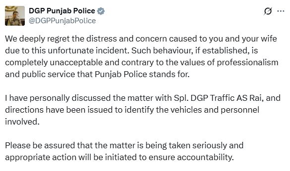 ਹੁੱਡਾ ਦੇ ਪੋਸਟ ‘ਤੇ DGP ਗੌਰਵ ਯਾਦਵ ਨੇ ਰਿਪਲਾਈ ਕਰਦਿਆਂ ਲਿਖਿਆ ਕਿ ਇਸ ਮੰਦਭਾਗੀ ਘਟਨਾ ਕਾਰਨ ਤੁਹਾਨੂੰ ਅਤੇ ਤੁਹਾਡੀ ਪਤਨੀ ਨੂੰ ਹੋਈ ਪਰੇਸ਼ਾਨੀ ਅਤੇ ਚਿੰਤਾ ਲਈ ਸਾਨੂੰ ਬਹੁਤ ਅਫ਼ਸੋਸ ਹੈ। ਜੇਕਰ ਅਜਿਹਾ ਵਿਵਹਾਰ ਸਾਬਤ ਹੁੰਦਾ ਹੈ, ਤਾਂ ਇਹ ਪੂਰੀ ਤਰ੍ਹਾਂ ਅਸਵੀਕਾਰਨਯੋਗ ਹੈ ਅਤੇ ਪੰਜਾਬ ਪੁਲਿਸ ਦੇ ਪੇਸ਼ੇਵਰਤਾ ਅਤੇ ਜਨਤਕ ਸੇਵਾ ਦੇ ਮੁੱਲਾਂ ਦੇ ਉਲਟ ਹੈ।