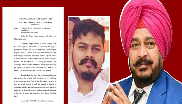 ਇਨਫੋਰਸਮੈਂਟ ਡਾਇਰੈਕਟੋਰੇਟ (ਈਡੀ) ਦੀ ਵਿਸ਼ੇਸ਼ ਅਦਾਲਤ ਨੇ ਪੰਜਾਬ ਦੇ ਸਾਬਕਾ ਜੰਗਲਾਤ ਮੰਤਰੀ ਸਾਧੂ ਸਿੰਘ ਧਰਮਸੋਤ ਦੇ ਪੁੱਤਰ ਹਰਪ੍ਰੀਤ ਸਿੰਘ ਨੂੰ 2024 ਦੇ ਮਨੀ ਲਾਂਡਰਿੰਗ (ਪੀਐਮਐਲਏ) ਮਾਮਲੇ ਵਿੱਚ ਭਗੌੜਾ (ਭਗੌੜਾ ਅਪਰਾਧੀ) ਐਲਾਨ ਦਿੱਤਾ ਹੈ। ਅਦਾਲਤ ਨੇ ਹਰਪ੍ਰੀਤ ਸਿੰਘ ਦੀਆਂ ਜਾਇਦਾਦਾਂ ਦੇ ਵੇਰਵੇ ਵੀ ਮੰਗੇ ਹਨ, ਤਾਂ ਜੋ ਜ਼ਾਬਤਾ ਫੌਜਦਾਰੀ ਪ੍ਰਕਿਰਿਆ (ਸੀਆਰਪੀਸੀ) ਦੀ ਧਾਰਾ 83 ਦੇ ਤਹਿਤ ਕੁਰਕੀ ਦੀ ਕਾਰਵਾਈ ਸ਼ੁਰੂ ਕੀਤੀ ਜਾ ਸਕੇ।
