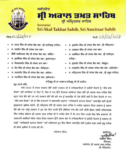 ਸ੍ਰੀ ਅਕਾਲ ਤਖ਼ਤ ਸਾਹਿਬ ਦੇ ਕਾਰਜਕਾਰੀ ਜਥੇਦਾਰ ਗਿਆਨੀ ਕੁਲਦੀਪ ਸਿੰਘ ਗੜਗੱਜ ਦੇ ਆਦੇਸ਼ ਅਨੁਸਾਰ ਸਕੱਤਰੇਤ ਸ੍ਰੀ ਅਕਾਲ ਤਖ਼ਤ ਸਾਹਿਬ ਨੇ ਭਾਰਤੀ ਸੰਸਦ ਦੇ ਲੋਕ ਸਭਾ ਅਤੇ ਰਾਜ ਸਭਾ ਦੇ ਸਿੱਖ ਸਾਂਸਦਾਂ ਨੂੰ ਇੱਕ ਵਿਸ਼ੇਸ਼ ਪੱਤਰ ਲਿਖ ਕੇ ਭਾਰਤ ਸਰਕਾਰ ਵੱਲੋਂ ਦਸਵੇਂ ਪਾਤਸ਼ਾਹ ਸ੍ਰੀ ਗੁਰੂ ਗੋਬਿੰਦ ਸਿੰਘ ਜੀ ਦੇ ਛੋਟੇ ਸਾਹਿਬਜ਼ਾਦਿਆਂ ਦੇ ਮਨਾਏ ਜਾਂਦੇ ਸ਼ਹੀਦੀ ਦਿਹਾੜੇ ਦੇ ਨਾਮ ਨੂੰ “ਵੀਰ ਬਾਲ ਦਿਵਸ” ਦੀ ਥਾਂ “ਸਾਹਿਬਜ਼ਾਦੇ ਸ਼ਹਾਦਤ ਦਿਵਸ” ਵਜੋਂ ਅਧਿਕਾਰਤ ਤੌਰ ਉੱਤੇ ਬਦਲਵਾਉਣ ਲਈ ਆਖਿਆ ਹੈ।