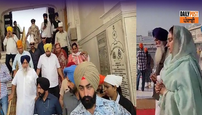 ਸ਼੍ਰੋਮਣੀ ਅਕਾਲੀ ਦਲ ਦੇ ਪ੍ਰਧਾਨ ਸੁਖਬੀਰ ਸਿੰਘ ਬਾਦਲ ਅਤੇ ਬਠਿੰਡਾ ਤੋਂ ਸੰਸਦ ਮੈਂਬਰ ਬੀਬੀ ਹਰਸਿਮਰਤ ਕੌਰ ਬਾਦਲ ਅੱਜ ਸੱਚਖੰਡ ਸ੍ਰੀ ਹਰਿਮੰਦਰ ਸਾਹਿਬ ਮੱਥਾ ਟੇਕਣ ਲਈ ਪਹੁੰਚੇ। ਇਸ ਮੌਕੇ ਉਨ੍ਹਾਂ ਕੀਰਤਨ ਸੁਣਿਆ, ਸਾਰਿਆਂ ਦੀ ਭਲਾਈ ਲਈ ਅਰਦਾਸ ਕੀਤੀ। ਹਰਸਿਮਰਤ ਕੌਰ ਬਾਦਲ ਸ੍ਰੀ ਅਕਾਲ ਤਖ਼ਤ ਸਾਹਿਬ ਦੇ ਨਾਲ ਲੱਗਦੇ ਗੁਰਦੁਆਰਾ ਗੁਰਬਖਸ਼ ਸਿੰਘ ਵਿਖੇ ਰੱਖੇ ਗਏ ਅਖੰਡ ਪਾਠ ਦੇ ਭੋਗ ਸਮਾਗਮ ਵਿੱਚ ਸ਼ਾਮਲ ਹੋਏ। ਮੁੱਖ ਸਕੱਤਰ ਕੁਲਵੰਤ ਸਿੰਘ ਮੰਨਣ, ਸ਼੍ਰੋਮਣੀ ਕਮੇਟੀ ਮੈਂਬਰ ਬੀਬੀ ਹਰਜੀਤ ਕੌਰ ਅਤੇ ਮੈਨੇਜਰ ਜਸਪਾਲ ਸਿੰਘ ਢੱਡੇ ਵੀ ਮੌਜੂਦ ਸਨ।