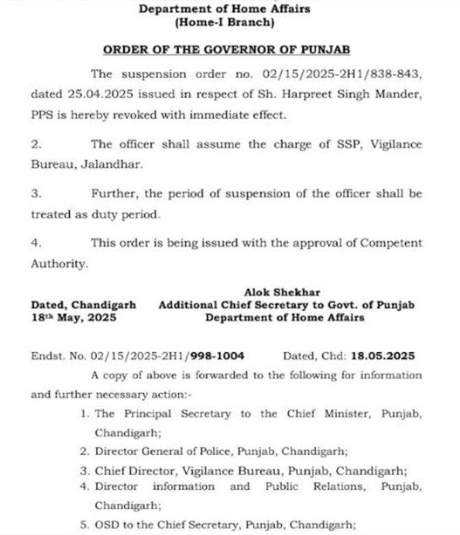 ਪੰਜਾਬ ਦੇ ਮੁੱਖ ਸਕੱਤਰ ਨੂੰ ਭੇਜੇ ਗਏ ਇੱਕ ਅਧਿਕਾਰਤ ਪੱਤਰ ਮੁਤਾਬਕ ਭਾਰਤ ਸਰਕਾਰ ਦੇ ਗ੍ਰਹਿ ਮੰਤਰਾਲੇ ਨੇ ਸੀਨੀਅਰ ਆਈਪੀਐਸ ਅਧਿਕਾਰੀ ਸੁਰਿੰਦਰ ਪਾਲ ਸਿੰਘ ਪਰਮਾਰ ਨੂੰ 23 ਜੂਨ, 2025 ਤੱਕ ਮੁਅੱਤਲ ਕਰਨ ਦੀ ਪੁਸ਼ਟੀ ਕੀਤੀ ਹੈ। ਇਹ ਪ੍ਰਵਾਨਗੀ ਪੰਜਾਬ ਸਰਕਾਰ ਦੇ 5 ਮਈ, 2025 ਦੇ ਇੱਕ ਪੱਤਰ ਤੋਂ ਬਾਅਦ ਆਲ ਇੰਡੀਆ ਸਰਵਿਸਿਜ਼ (ਅਨੁਸ਼ਾਸਨ ਅਤੇ ਅਪੀਲ) ਨਿਯਮ, 1969 ਦੇ ਨਿਯਮ 3(1) ਦੇ ਤਹਿਤ ਦਿੱਤੀ ਗਈ ਸੀ।