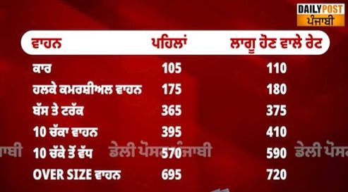 ਉਨ੍ਹਾਂ ਦੱਸਿਆ ਕਿ ਟੋਲ ਪਲਾਜ਼ਿਆਂ ‘ਤੇ ਨਵੀਆਂ ਰੇਟ ਸੂਚੀਆਂ ਲਗਾਉਣ ਦੀ ਪ੍ਰਕਿਰਿਆ ਸ਼ੁਰੂ ਕਰ ਦਿੱਤੀ ਗਈ ਹੈ। ਇਸ ਤੋਂ ਬਾਅਦ ਕਾਰਾਂ, ਜੀਪਾਂ, ਵੈਨਾਂ ਜਾਂ ਲਾਈਟ ਮੋਟਰ ਵਾਹਨਾਂ ਨੂੰ 15 ਰੁਪਏ, ਹਲਕੇ ਵਪਾਰਕ ਵਾਹਨਾਂ ਨੂੰ 25 ਰੁਪਏ ਅਤੇ ਬੱਸਾਂ ਜਾਂ ਟਰੱਕਾਂ ਅਤੇ 3 ਐਕਸਐਲ ਕਮਰਸ਼ੀਅਲ ਵਾਹਨਾਂ ਨੂੰ ਪਹਿਲਾਂ ਨਾਲੋਂ 45 ਰੁਪਏ ਵੱਧ ਦੇਣੇ ਪੈਣਗੇ।