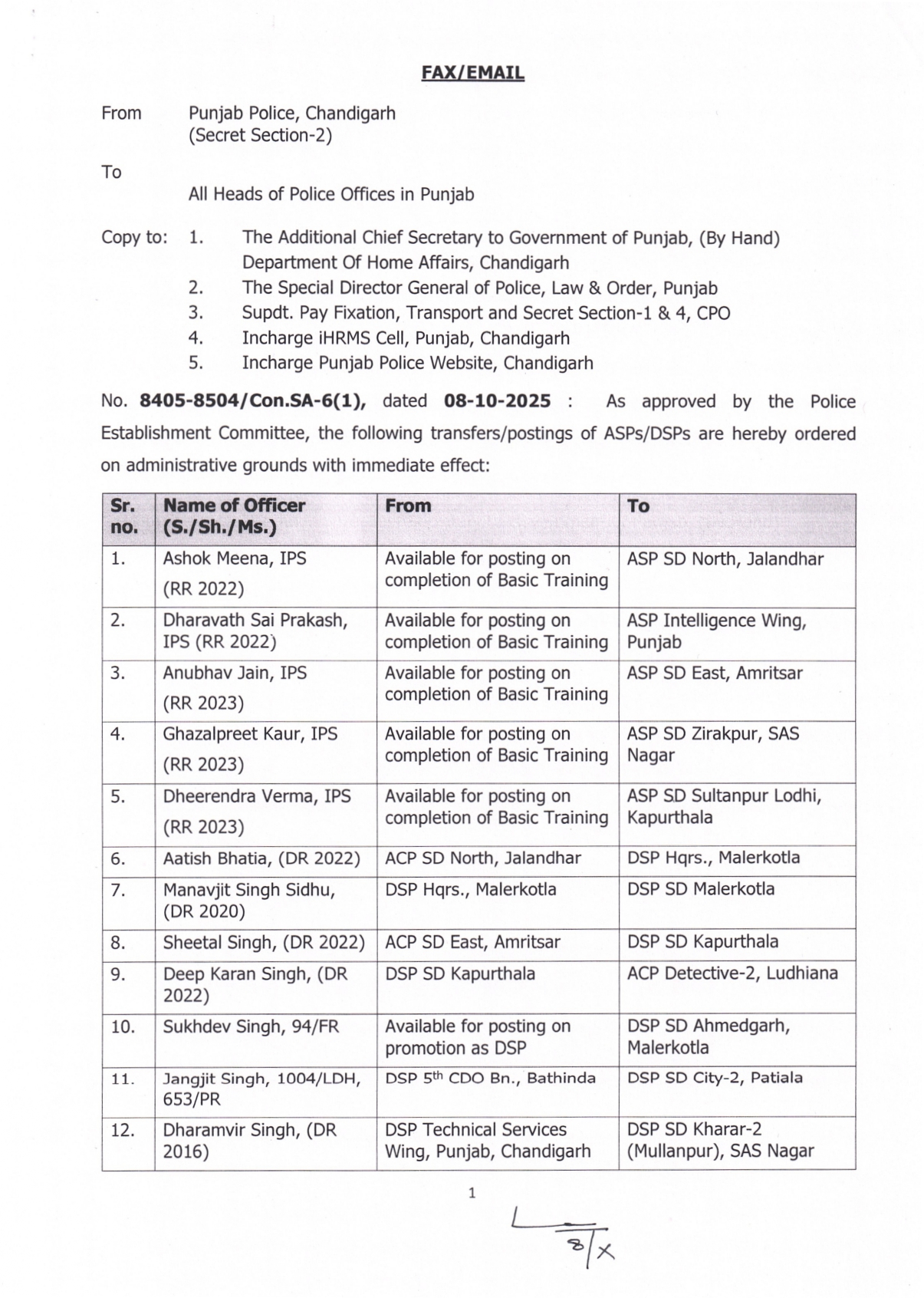ਪੰਜਾਬ ਪੁਲਿਸ ਨੇ ਵੱਡੀ ਗਿਣਤੀ ਵਿੱਚ ASP ਅਤੇ DSP ਰੈਂਕ ਦੇ ਅਧਿਕਾਰੀਆਂ ਦੇ ਤਬਾਦਲੇ ਕੀਤੇ ਹਨ। 133 ਅਧਿਕਾਰੀਆਂ ਦੇ ਤਬਾਦਲੇ ਦੇ ਹੁਕਮ ਜਾਰੀ ਕੀਤੇ ਗਏ ਹਨ। ਇਸ ਸਮੇਂ ਦੌਰਾਨ ਨਿਯੁਕਤ ਕੀਤੇ ਗਏ ਅਧਿਕਾਰੀ ਕਾਫ਼ੀ ਸਮੇਂ ਤੋਂ ਪੋਸਟਿੰਗ ਦੀ ਉਡੀਕ ਕਰ ਰਹੇ ਸਨ। ਇਨ੍ਹਾਂ ਅਧਿਕਾਰੀਆਂ ਨੂੰ ਵਿਜੀਲੈਂਸ ਬਿਊਰੋ ਅਤੇ ਰੋਡ ਸੇਫਟੀ ਫੋਰਸ ਸਮੇਤ ਵੱਖ-ਵੱਖ ਵਿੰਗਾਂ ਵਿੱਚ ਤਾਇਨਾਤ ਕੀਤਾ ਗਿਆ ਹੈ।