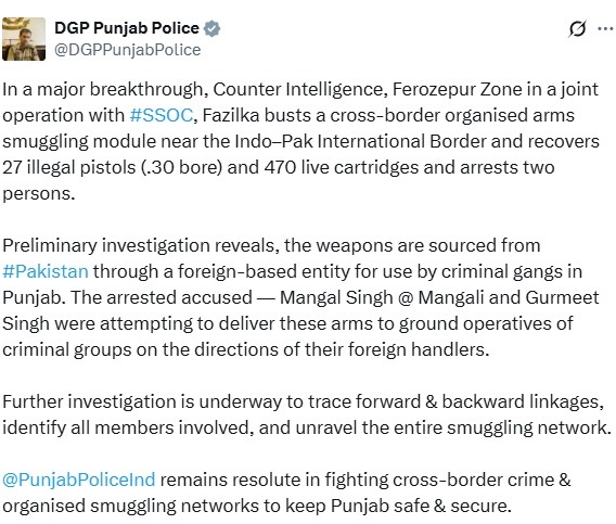 ਪੰਜਾਬ ਪੁਲਿਸ ਨੇ ਇੱਕ ਅੰਤਰਰਾਸ਼ਟਰੀ ਹਥਿਆਰ ਤਸਕਰੀ ਗਿਰੋਹ ਦਾ ਪਰਦਾਫਾਸ਼ ਕੀਤਾ ਹੈ। ਕਾਊਂਟਰ ਇੰਟੈਲੀਜੈਂਸ ਫਿਰੋਜ਼ਪੁਰ/ਫਰੀਦਕੋਟ ਅਤੇ ਐਸਐਸਓਸੀ ਫਾਜ਼ਿਲਕਾ ਵੱਲੋਂ ਕੀਤੀ ਗਈ ਸਾਂਝੀ ਕਾਰਵਾਈ ਵਿੱਚ, ਭਾਰਤ-ਪਾਕਿਸਤਾਨ ਅੰਤਰਰਾਸ਼ਟਰੀ ਸਰਹੱਦ ਨੇੜੇ ਸਰਗਰਮ ਇੱਕ ਹਥਿਆਰ ਤਸਕਰੀ ਨੈਟਵਰਕ ਦਾ ਪਰਦਾਫਾਸ਼ ਕੀਤਾ ਗਿਆ ਅਤੇ ਦੋ ਮੁਲਜ਼ਮਾਂ ਨੂੰ ਗ੍ਰਿਫ਼ਤਾਰ ਕੀਤਾ ਗਿਆ।