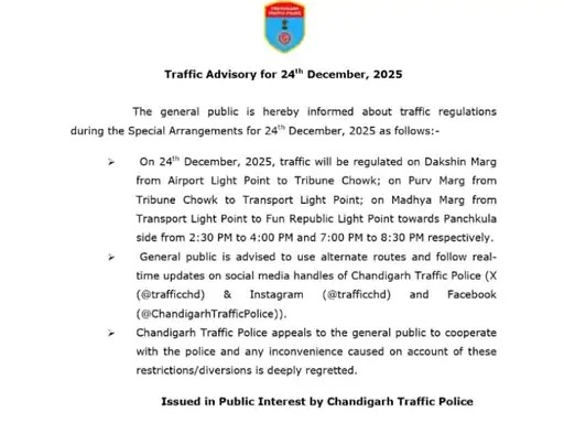 ਟ੍ਰੈਫਿਕ ਪੁਲਿਸ ਦੇ ਅਨੁਸਾਰ, 24 ਦਸੰਬਰ ਨੂੰ, ਦੱਖਣ ਮਾਰਗ ‘ਤੇ ਏਅਰਪੋਰਟ ਲਾਈਟ ਪੁਆਇੰਟ ਤੋਂ ਟ੍ਰਿਬਿਊਨ ਚੌਕ ਤੱਕ, ਪੂਰਵਾ ਮਾਰਗ ‘ਤੇ ਟ੍ਰਿਬਿਊਨ ਚੌਕ ਤੋਂ ਟ੍ਰਾਂਸਪੋਰਟ ਲਾਈਟ ਪੁਆਇੰਟ ਤੱਕ ਅਤੇ ਟਰਾਂਸਪੋਰਟ ਲਾਈਟ ਪੁਆਇੰਟ ਤੋਂ ਮੱਧ ਮਾਰਗ ਤੋਂ ਫਨ ਰਿਪਬਲਿਕ ਲਾਈਟ ਪੁਆਇੰਟ ਤੱਕ (ਪੰਚਕੂਲਾ ਵੱਲ) ਆਵਾਜਾਈ ਨੂੰ ਕੰਟਰੋਲ ਕੀਤਾ ਜਾਵੇਗਾ। ਇਹ ਟ੍ਰੈਫਿਕ ਨਿਯਮ ਦੁਪਹਿਰ 2:30 ਵਜੇ ਤੋਂ ਸ਼ਾਮ 4:00 ਵਜੇ ਤੱਕ ਅਤੇ ਸ਼ਾਮ 7:00 ਵਜੇ ਤੋਂ ਰਾਤ 8:30 ਵਜੇ ਤੱਕ ਲਾਗੂ ਰਹੇਗਾ।