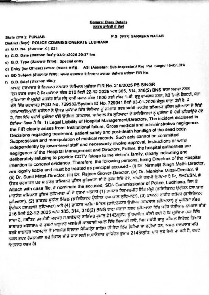 ਦੱਸ ਦੇਈਏ ਕਿ ਲੁਧਿਆਣਾ ਦੇ ਬਾੜੇਵਾਲ ਰੋਡ ਸਥਿਤ ਆਰੀਸਨ ਹਸਪਤਾਲ ਤੋਂ 13 ਦਿਨ ਪਹਿਲਾਂ ਇੱਕ ਮਹਿਲਾ ਦੀ ਲਾਸ਼ ਗਾਇਕ ਹੋਈ ਸੀ। ਇਸ ਮਾਮਲੇ ਵਿਚ ਸਖਤ ਕਾਰਵਾਈ ਕਰਦਿਆਂ ਪੁਲਿਸ ਵੱਲੋਂ ਐੱਫ.ਆਈ.ਆਰ. ਦਰਜ ਕੀਤੀ ਗਈ ਹੈ। ਹਸਪਤਾਲ ਦੇ ਚਾਰ ਡਾਇਰੈਕਟਰਾਂ ਖਿਲਾਫ਼ ਕਾਨੂੰਨੀ ਕਾਰਵਾਈ ਸ਼ੁਰੂ ਕਰ ਦਿੱਤੀ ਗਈ ਹੈ। ਪੁਲਿਸ ਨੇ ਇਸ ਮਾਮਲੇ ਵਿੱਚ ਡਾਇਰੈਕਟਰਾਂ ਨੂੰ ਮੁੱਖ ਦੋਸ਼ੀ ਵਜੋਂ ਨਾਮਜ਼ਦ ਕੀਤਾ ਹੈ।