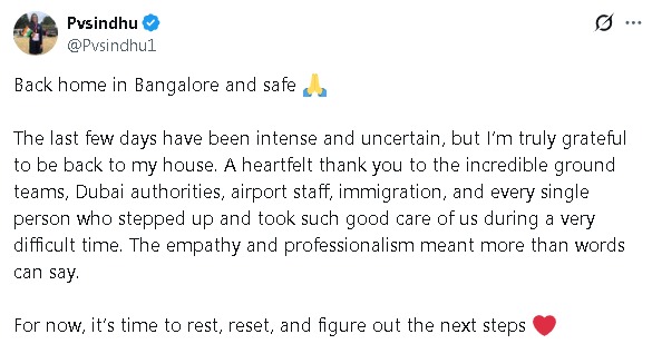 ਦੁਬਈ ‘ਚ ਫਸੀ ਬੈਡਮਿੰਟਨ ਖਿਡਾਰਨ ਪੀਵੀ ਸਿੰਧੂ ਸੁਰੱਖਿਅਤ ਪਰਤੀ ਭਾਰਤ, ਦੁਬਈ ਏਅਰਪੋਰਟ ਦੇ ਸਟਾਫ ਦਾ ਕੀਤਾ ਧੰਨਵਾਦ