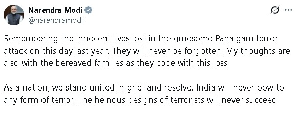 ਪਹਿਲਗਾਮ ਹਮਲੇ ਦੀ ਅੱਜ ਪਹਿਲੀ ਬਰਸੀ ‘ਤੇ, ਪ੍ਰਧਾਨ ਮੰਤਰੀ ਨਰਿੰਦਰ ਮੋਦੀ ਨੇ ਇੱਕ ਸਖ਼ਤ ਸੰਦੇਸ਼ ਦਿੱਤਾ। ਉਨ੍ਹਾਂ ਕਿਹਾ ਕਿ ਮਾਸੂਮ ਲੋਕਾਂ ਦੀਆਂ ਮੌਤਾਂ ਨੂੰ ਭੁਲਾਇਆ ਨਹੀਂ ਜਾ ਸਕਦਾ। ਪਹਿਲਗਾਮ ਹਮਲੇ ਵਿੱਚ ਮਾਸੂਮ ਲੋਕ ਮਾਰੇ ਗਏ। ਹਮਲੇ ਵਿੱਚ ਮਾਰੇ ਗਏ ਲੋਕਾਂ ਨੂੰ ਭੁਲਾਇਆ ਨਹੀਂ ਜਾਵੇਗਾ। ਅੱਤਵਾਦੀਆਂ ਦੇ ਨਾਪਾਕ ਮਨਸੂਬੇ ਕਦੇ ਵੀ ਸਫਲ ਨਹੀਂ ਹੋਣਗੇ। ਭਾਰਤ ਕਿਸੇ ਵੀ ਤਰ੍ਹਾਂ ਦੇ ਅੱਤਵਾਦ ਅੱਗੇ ਨਹੀਂ ਝੁਕੇਗਾ। ਅਸੀਂ ਇਸ ਦੁੱਖ ਅਤੇ ਦ੍ਰਿੜਤਾ ਦੇ ਪਲ ਵਿੱਚ ਇੱਕ ਰਾਸ਼ਟਰ ਵਜੋਂ ਇੱਕਜੁੱਟ ਖੜ੍ਹੇ ਹਾਂ।