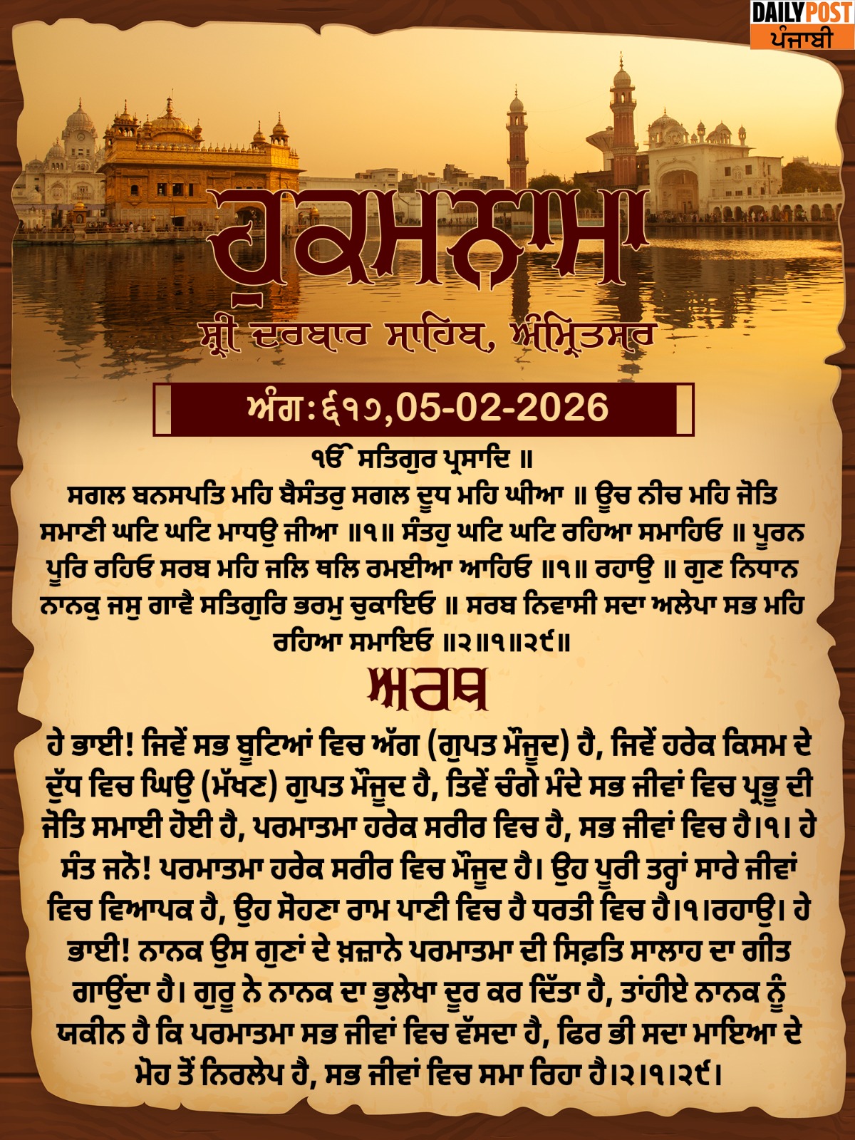 ਸ੍ਰੀ ਦਰਬਾਰ ਸਾਹਿਬ ਤੋਂ ਅੱਜ ਦਾ ਹੁਕਮਨਾਮਾ