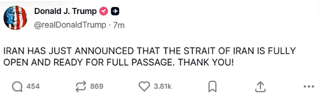 ਅਮਰੀਕੀ ਰਾਸ਼ਟਰਪਤੀ ਡੋਨਾਲਡ ਟਰੰਪ ਨੇ ਆਪਣੇ ਸੋਸ਼ਲ ਮੀਡੀਆ ਪਲੇਟਫਾਰਮ ‘ਤੇ ਫੈਸਲੇ ‘ਤੇ ਪ੍ਰਤੀਕਿਰਿਆ ਦਿੰਦੇ ਹੋਏ ਲਿਖਿਆ, “ਈਰਾਨ ਨੇ ਹੁਣੇ ਐਲਾਨ ਕੀਤਾ ਹੈ ਕਿ ਹੋਰਮੁਜ਼ ਜਲਡਮਰੂ ਪੂਰੀ ਤਰ੍ਹਾਂ ਖੁੱਲ੍ਹਾ ਹੈ ਅਤੇ ਪੂਰੀ ਆਵਾਜਾਈ ਲਈ ਤਿਆਰ ਹੈ। ਧੰਨਵਾਦ!”