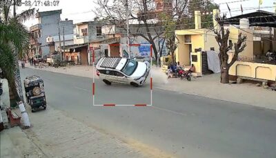 ਖੰਭੇ ‘ਚ ਵੱਜੀ ਫੁੱਲ ਸਪੀਡ ਨਾਲ ਆਉਂਦੀ ਕਾਰ, ਟਾਇਰ ਫਟਣ ਨਾਲ ਹੋਈ ਬੇਕਾਬੂ, ਬਣਿਆ ਫਿਲਮੀ ਸੀਨ