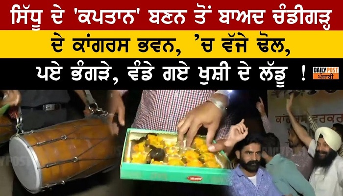 ਸਿੱਧੂ ਦੇ ‘ਕਪਤਾਨ’ ਬਣਨ ਤੋਂ ਬਾਅਦ ਚੰਡੀਗੜ੍ਹ ਦੇ ਕਾਂਗਰਸ ਭਵਨ ,ਚ ਵੱਜ ਰਹੇ ਢੋਲ, ਵੰਡੇ ਜਾ ਰਹੇ ਖੁਸ਼ੀ ਦੇ ਲੱਡੂ