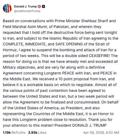 ਟਰੰਪ ਨੇ ਇੱਕ ਸੋਸ਼ਲ ਮੀਡੀਆ ਪੋਸਟ ਵਿੱਚ ਲਿਖਿਆ ਕਿ, “ਪਾਕਿਸਤਾਨੀ ਪ੍ਰਧਾਨ ਮੰਤਰੀ ਸ਼ਾਹਬਾਜ਼ ਸ਼ਰੀਫ ਅਤੇ ਫੀਲਡ ਮਾਰਸ਼ਲ ਅਸੀਮ ਮੁਨੀਰ ਨਾਲ ਮੇਰੀ ਗੱਲਬਾਤ ਦੇ ਆਧਾਰ ‘ਤੇ, ਜਿਸ ਵਿੱਚ ਉਨ੍ਹਾਂ ਨੇ ਅੱਜ ਰਾਤ ਮੈਨੂੰ ਈਰਾਨ ਨੂੰ ਭੇਜੀ ਜਾ ਰਹੀ ਵਿਨਾਸ਼ਕਾਰੀ ਤਾਕਤ ਨੂੰ ਰੋਕਣ ਲਈ ਬੇਨਤੀ ਕੀਤੀ ਅਤੇ ਇਸ ਸ਼ਰਤ ‘ਤੇ ਕਿ ਈਰਾਨ ਹੋਰਮੁਜ਼ ਜਲਡਮਰੂ ਨੂੰ ਪੂਰੀ ਤਰ੍ਹਾਂ, ਤੁਰੰਤ ਅਤੇ ਸੁਰੱਖਿਅਤ ਢੰਗ ਨਾਲ ਖੋਲ੍ਹਣ ਲਈ ਸਹਿਮਤ ਹੋਵੇ, ਮੈਂ ਦੋ ਹਫ਼ਤਿਆਂ ਦੀ ਮਿਆਦ ਲਈ ਈਰਾਨ ‘ਤੇ ਬੰਬਾਰੀ ਅਤੇ ਹਮਲੇ ਮੁਅੱਤਲ ਕਰਨ ਲਈ ਸਹਿਮਤ ਹੋ ਗਿਆ ਹਾਂ।”